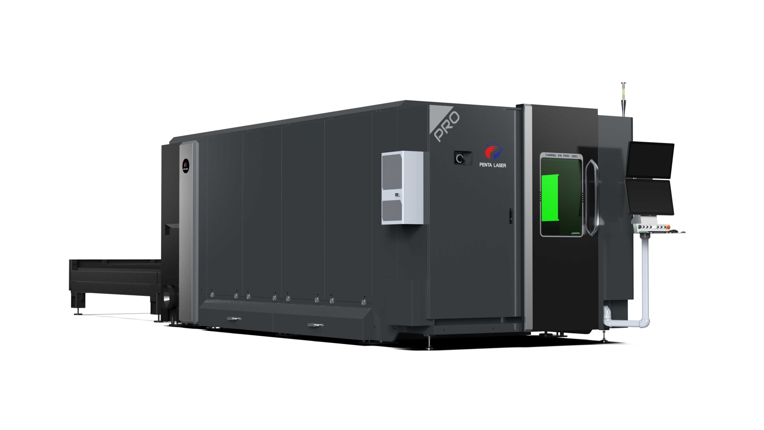 SWING VII PRO 3015 – tai aukštos klasės pluoštinio lazerio pjovimo staklės, skirtos efektyviam ir preciziškam lakštinio metalo apdirbimui moderniose gamybos įmonėse. Įrenginys sukurtas kaip pilnai uždara (fully enclosed) sistema su keičiamu darbo stalu, užtikrinanti ne tik aukštą našumą, bet ir maksimalų operatoriaus saugumą bei stabilų darbą intensyviu režimu. Šios serijos staklės pasižymi pažangia itališka technologija, patikimais pasaulinių gamintojų komponentais ir optimaliu kainos bei kokybės santykiu.