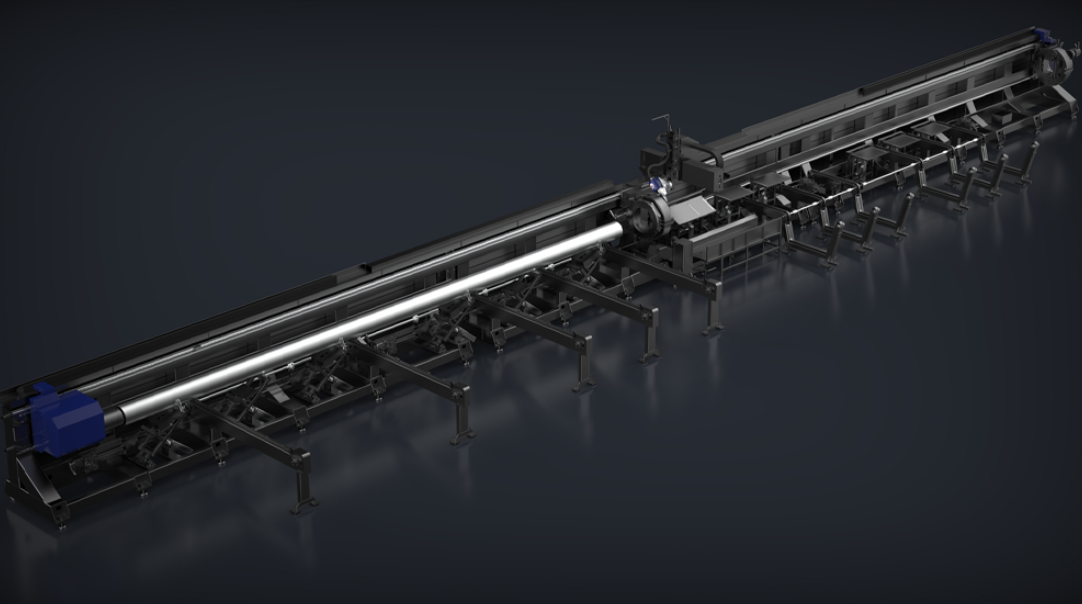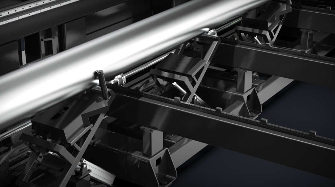 Staklėse integruota automatinė pakrovimo ir iškrovimo sistema su grandininiu konvejeriu bei servo valdomais atraminiais elementais, kurie automatiškai prisitaiko prie vamzdžio aukščio ir užtikrina stabilų transportavimą viso pjovimo proceso metu. Sistema leidžia automatizuoti darbą, sumažinti rankinį darbą ir padidinti gamybos efektyvumą.